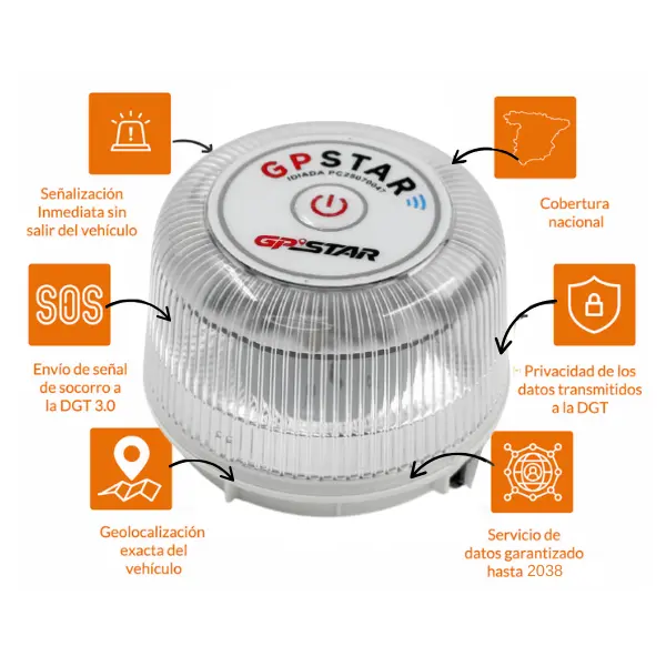 Cumplimiento normativo DGT, Iluminación LED de alta luminosidad, Batería de respaldo, Resistente al polvo y agua, Indicador de funcionamiento